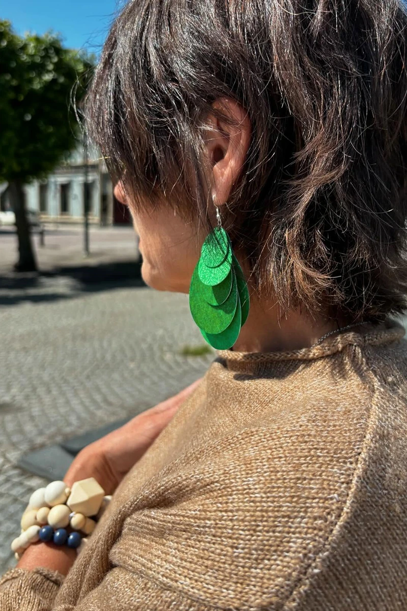 Stora ultralätta  gröna örhängen, färgglada! Finns i två storlekar, riktigt stora för dig som vågar eller lite mindre om du är försiktigare. Bekväma och lätta så du kan bära dem hela dagen. Stilren svensk design som ändå väcker uppmärksamhet. De här stora men lätta örhängena passar både till vardags och fest!